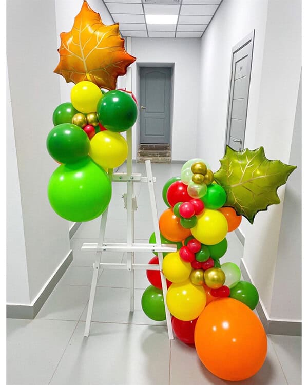 Набор состоит из разнокалиберных гирлянд с использованием латексных шариков и фольгированных листочков.
